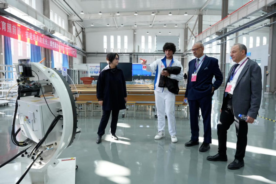 随后,代表团一行来到新利18平台参观交流,院长李云梅、副院长刘悦凌、国际交流与合作部部长王娟及相关负责人员陪同。代表团参观了产教融合大楼和鲁班工坊建设·体验馆,详细了解了学院的课程设置、实训设施以及人才培养模式,并对学院的职业教育体系给予了高度评价。在参观过程中,他们与埃及留学生亲切地交流并询问了他们的学习和生活情况。