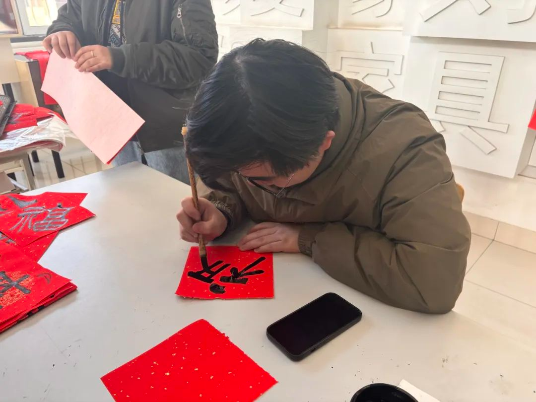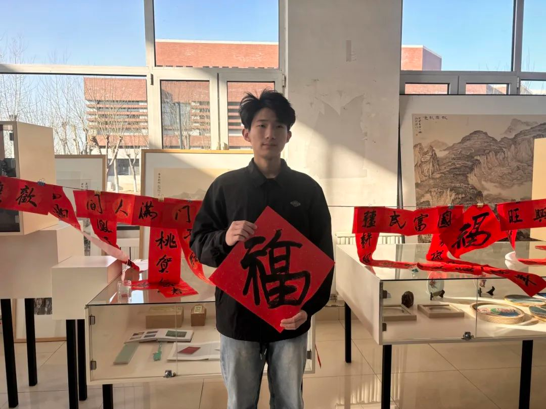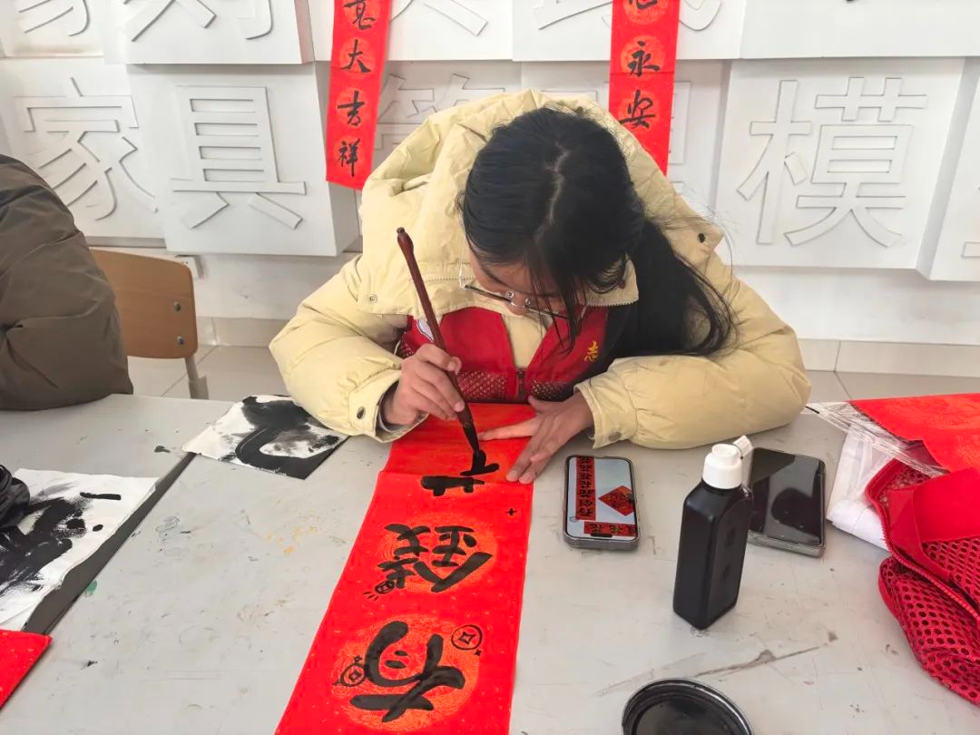 同学们拿到对联后,迫不及待地将其展开,轻声念诵着上面的文字。而那一幅幅苍劲有力、飘逸灵动的对联,恰似一条条无形的纽带,将文化的传承、校园的情谊紧紧相连,编织成一幅温馨而美好的校园新春画卷。