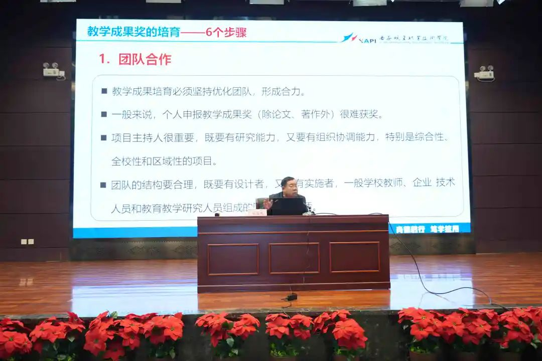 赵居礼教授从教学成果奖概述、教学成果奖的培育、教学成果奖申报材料的撰写和教学成果奖申报的注意事项等4个方面对全体参会教师进行了题为《教学成果奖的培育与申报》专题培训。赵教授指出教学成果奖不仅是对教师个人或团队教学研究成果的肯定,更是学校整体教学水平和教育教学改革成效的直接体现。他结合多年教研课题及申报教学成果奖的经验和做法,对教学成果奖的内涵定位,培育过程以及申报材料的撰写进行了深入浅出的讲解,更新了在座教师对教学成果奖的认识,理清了以往认知的误区,为教学成果奖及教改项目的申报准备指明了方向。