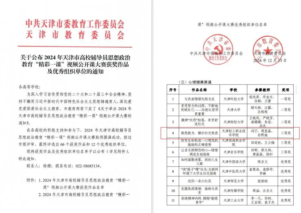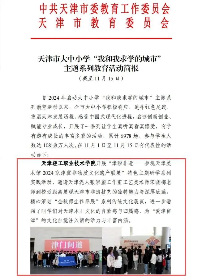 贯彻党的二十大精神及习近平总书记视察天津重要讲话精神,引导学生了解天津、热爱天津、建设天津,我院“我和我求学的城市”主题系列教育活动三次入选市教委简报。与陈官屯大运河博物馆、桂发祥等多地共建协同育人模式,建设6个思政实践基地,申报《轻新素质教育基地》入选2025年度学生综合素质训练基地推荐名单,推动思政教育高质量发展。