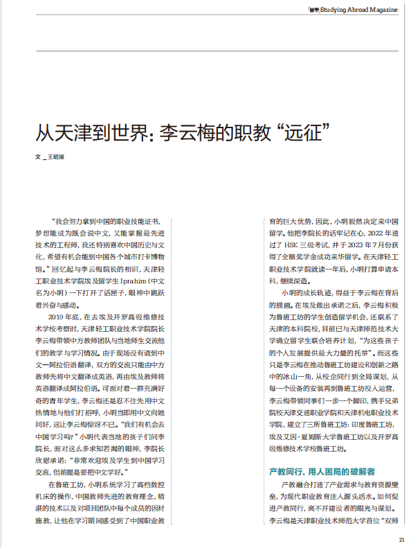 近日,光明日报出版社《留学》杂志2025年第6期“人物”专栏采访我院院长李云梅,并刊登了题为“从天津到世界:李云梅的职教‘远征’”的文章,文章讲述了我院院长李云梅在推动中国职业教育国际化进程中的杰出贡献,特别是在鲁班工坊的建设和推广方面所取得的显著成就。