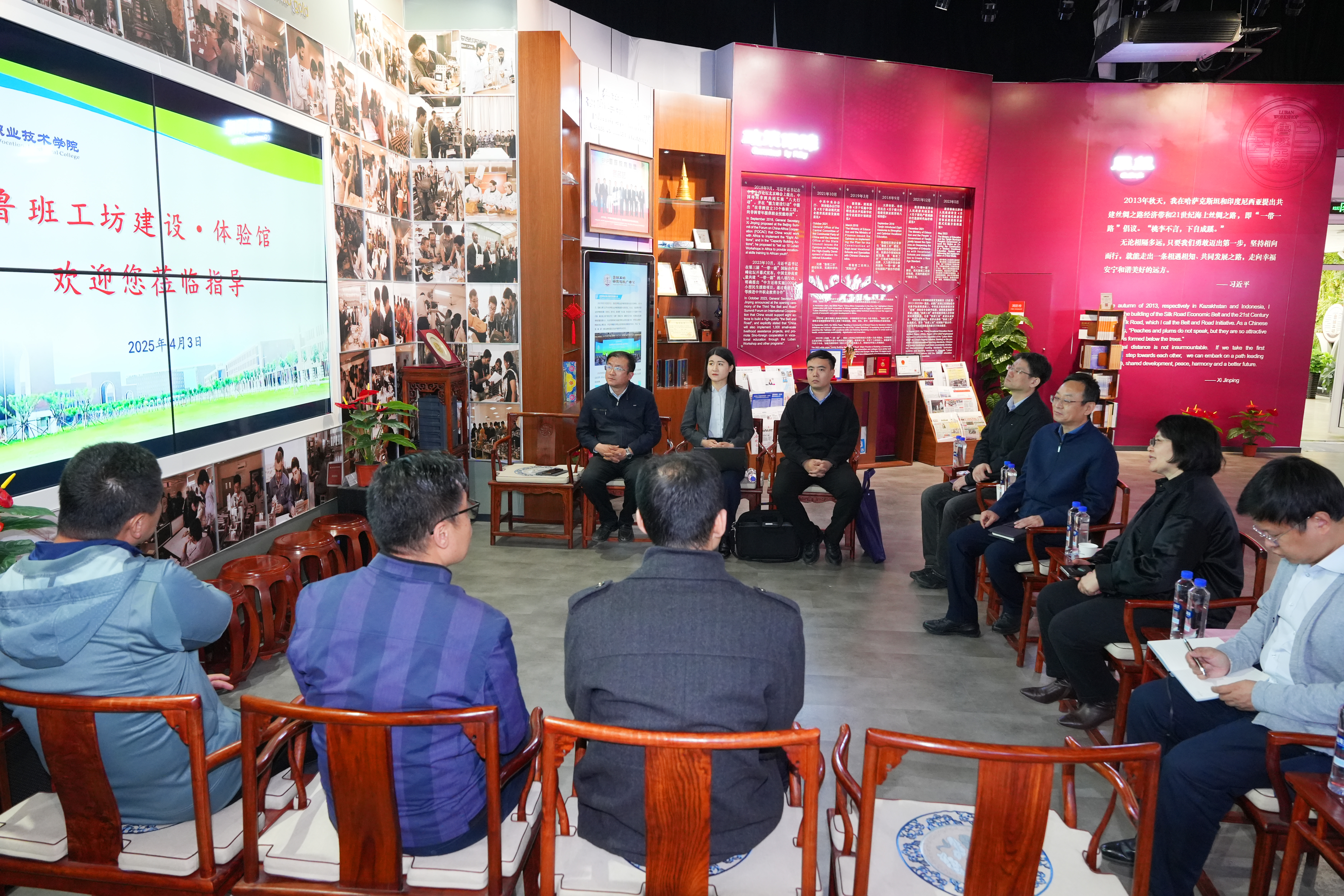 最后,参观了鲁班工坊建设·体验馆,整体了解了鲁班工坊建设的重要节点和标志性成果,以及近年来天津职业教育在国际化方面取得的显著成效。