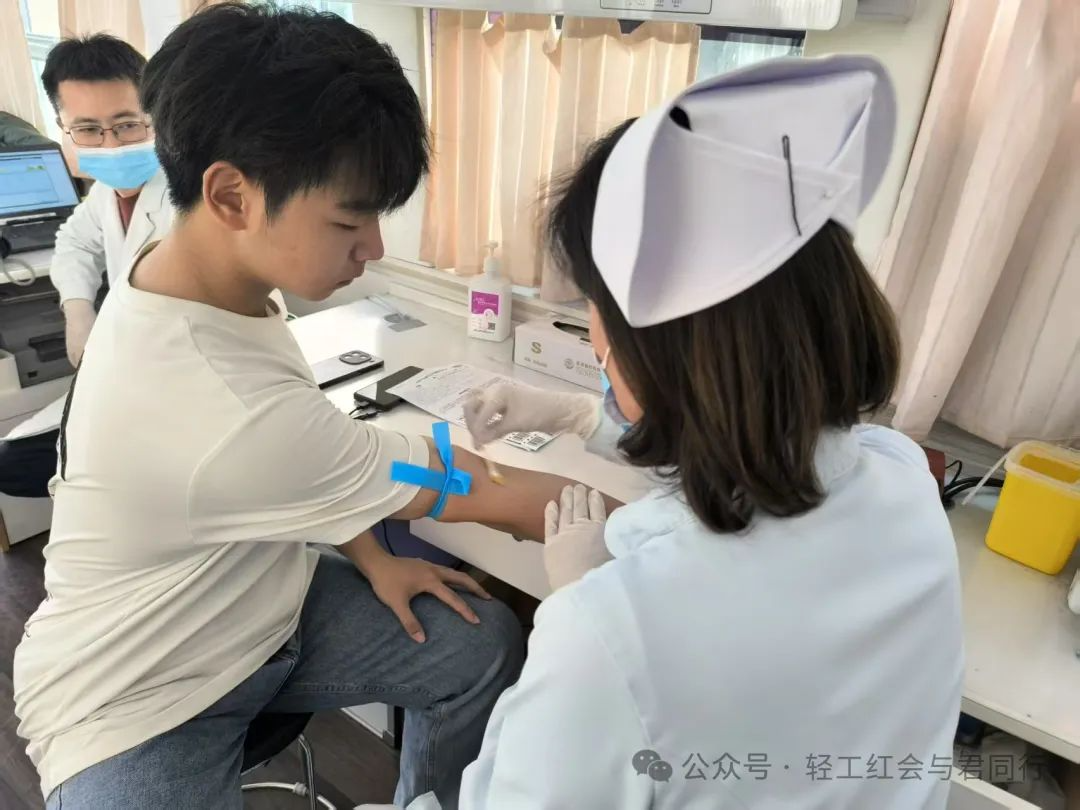 师生们志愿服务的热情高涨。学工党支部的党员老师们共同参与献血宣传工作,现场耐心讲解献血后的注意事项,引导献血者采血,并叮嘱其注意休息。师生志愿服务团队以饱满的热情传递着轻工人的公益精神。