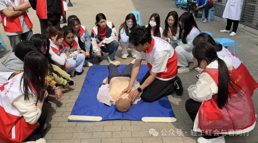此外,红十字会志愿者们利用现场搭建的平台对前来咨询和驻足的师生进行了简单的伤口包扎、心肺复苏等急救知识的展示。