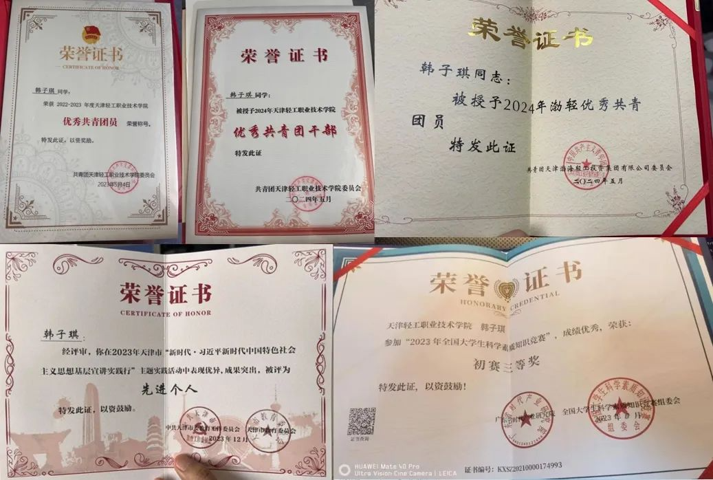 学习方面,韩子琪脚踏实地,努力拼搏,不断进取。在校期间,她累计获得校级一等奖学金两次、优秀大学生两次、天津市“习近平新时代中国特色社会主义思想基层宣讲实践行”先进个人等20余项荣誉奖项。2024年7月,她与团队同学一起参加了大学生创业大赛,获得中国国际大学生创新大赛青年红色筑梦之旅赛道天津赛区铜奖。