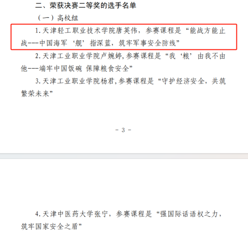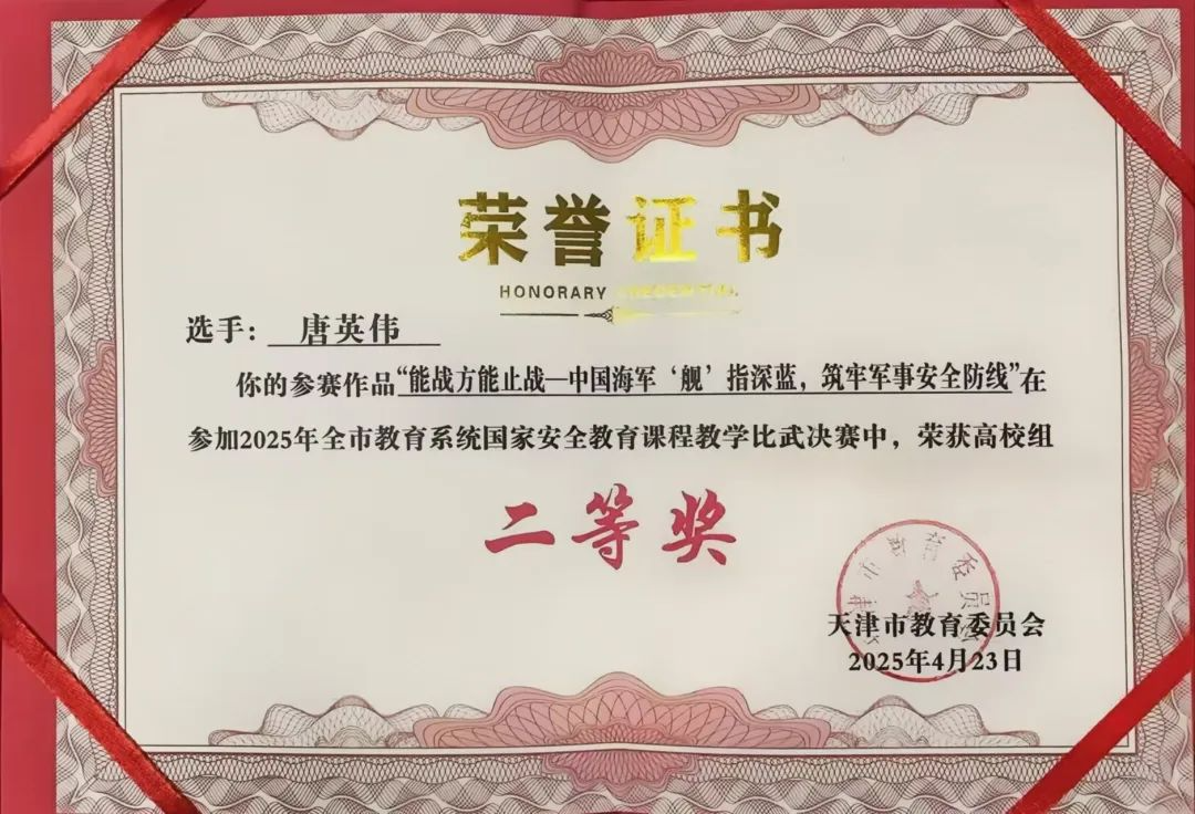为深入贯彻习近平总书记关于全面加强国家安全教育的重要指示精神,切实落实总体国家安全观,按照《天津市教育系统2025年度全民国家安全教育日宣传教育活动方案》安排,4月19日由市教育两委主办,市教科院、市教育安全研究中心协办,天津工业大学承办的国家安全教育课程教学比武决赛圆满落下帷幕。我院马克思主义学院唐英伟老师荣获二等奖。