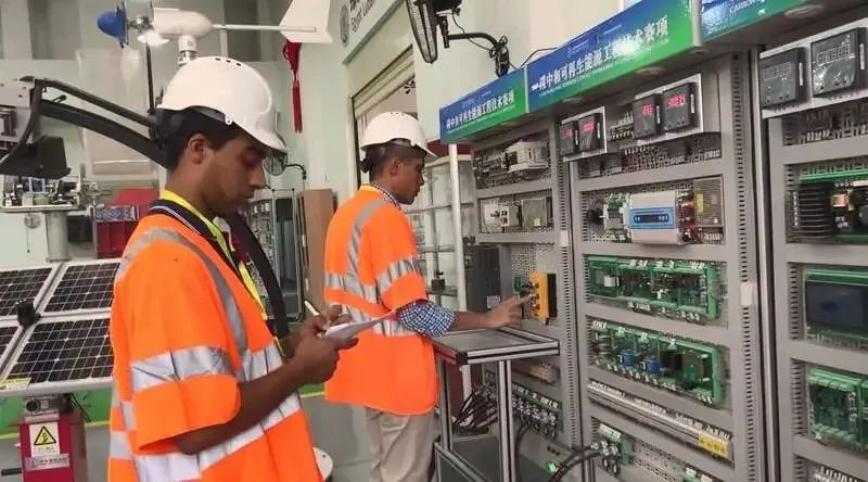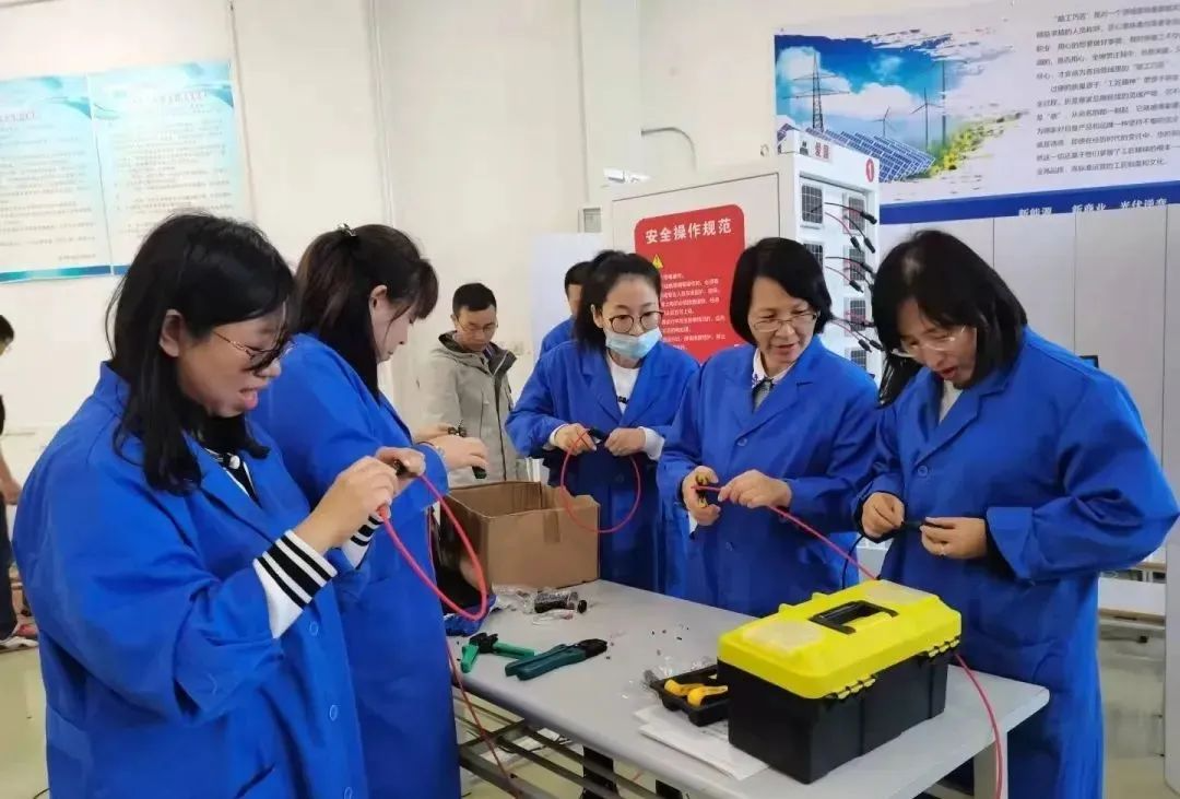 参观新能源技术产教融合基地,并与中国学生组队开展技能交流切磋,利用光伏电站运维设备考察光伏组件的连接技能,主要包括光伏MC4接头制作、光伏组串连接、光伏组串拆卸,考察要点包括接头制作的规范性和牢固性,光伏组串拆卸和连接的规范性。