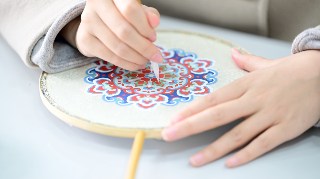 鲁班工坊建设·体验馆参观结束,组织中外学生共同完成团扇制作,使得外国鲁班工坊留学生能够了解相关中国文化,同时拓展中国学生国际视野。