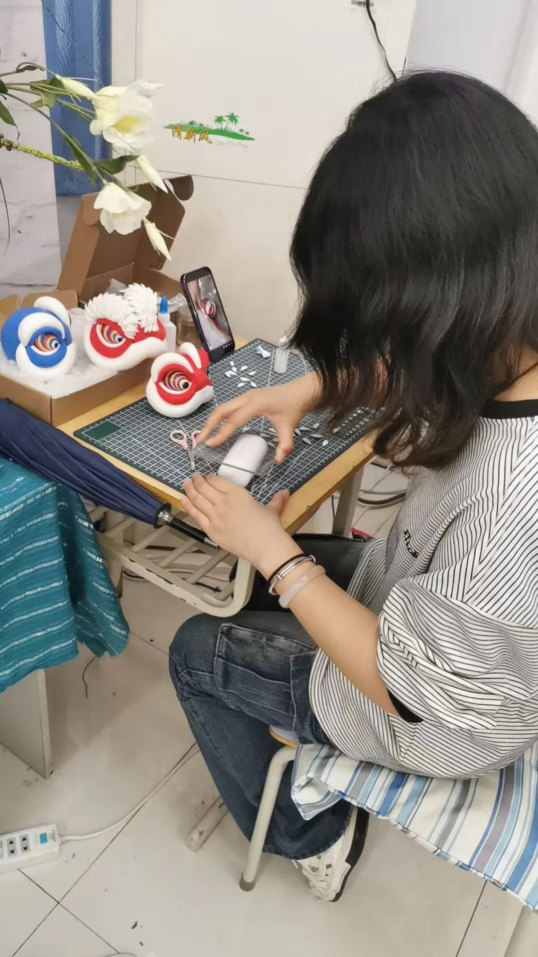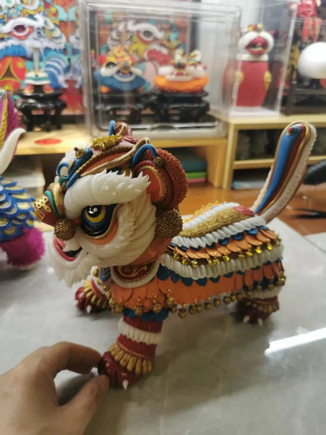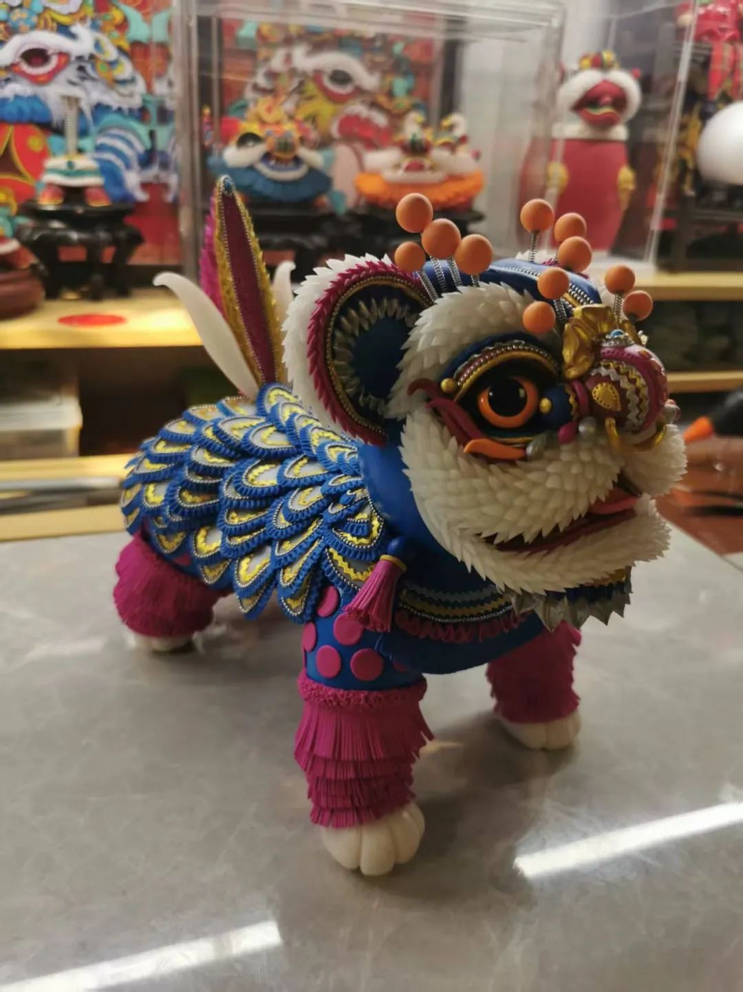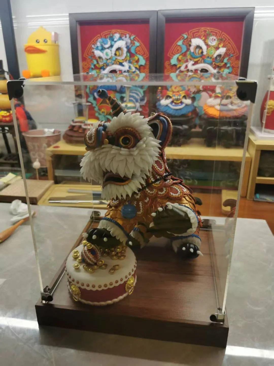活动区内陈列了由艺术工程学院赵旸老师带领和指导学生共同创作的各种彩塑作品,多以热门国漫角色为原型,结合天津本土彩塑技艺,塑造了兼具传统审美与现代IP特征的立体形象。尤其是赵老师的系列代表作《醒狮》,将醒狮元素融入动漫角色设计,既保留了醒狮的威武神态,又通过夸张的造型和色彩赋予其年轻化表达。