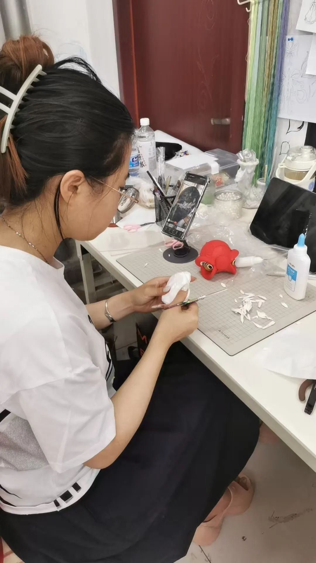 在现场,专门设置了彩塑技艺互动体验区,观众可通过现场教学尝试制作简易彩塑模型,近距离感受非遗工艺的匠心魅力。赵老师表示,此类实践不仅让学生掌握了传统技艺,而且进一步培养了其将文化符号转化为现代IP的创新能力。目前,团队已联合相关动漫企业及非遗工坊,共同研发多款兼具市场潜力与文化价值的IP作品,部分学生积极筹备自己的工作室,计划自主创业,拓展周边产品的推广渠道,赋能文化创新。