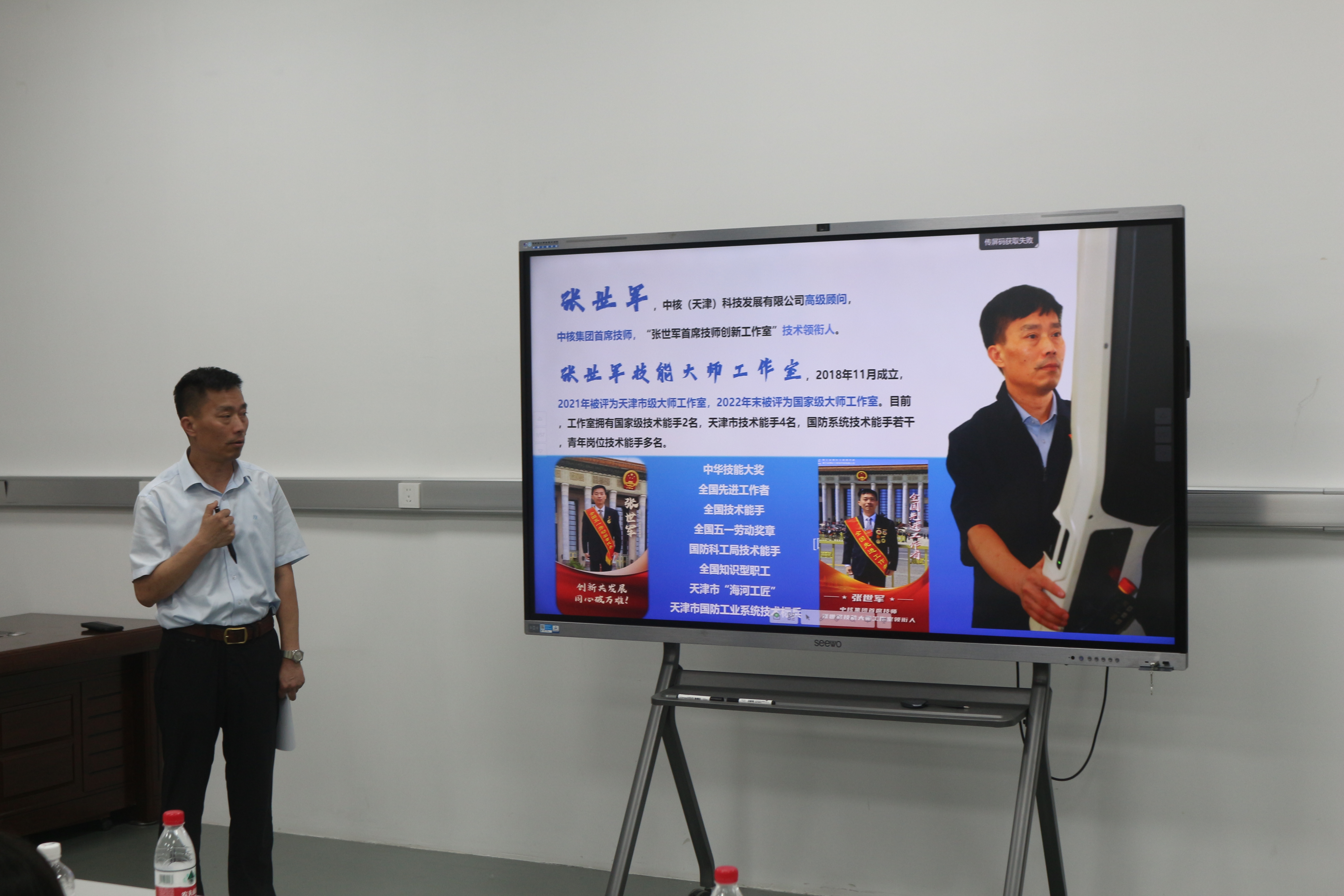 近日,在职业教育活动周、天津技能周活动期间,为传承和弘扬劳模精神、劳动精神、工匠精神,培育学生专注严谨、精益求精的职业素养,推动校园文化建设,学院邀请全国劳动模范、全国先进工作者、全国中华技能大奖获得者、国家级技能大师、核工业理化工程研究院(以下简称“核理化院”)首席专家张世军到校开展交流访问。学院副院长刘悦凌、机械工程学院党总支书记郭桦、副院长周京、国家级技能大师史清卫陪同接待,双方就深化校企合作、推动产教融合等方面开展深入交流。