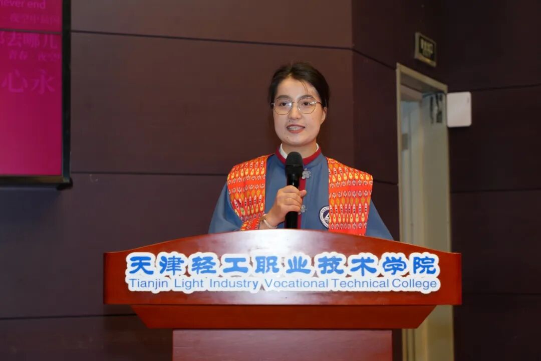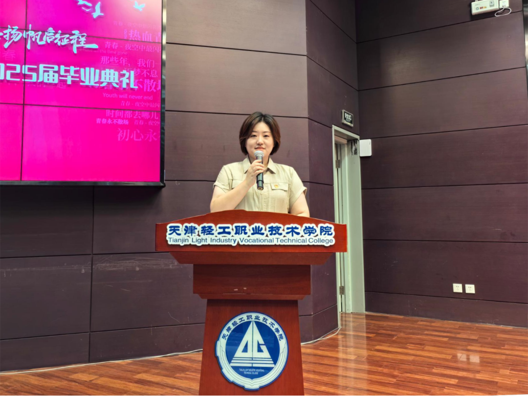 学院行业导师,天津胜美科技有限公司总经理章莹女士向圆满完成学业的2025届全体毕业生表示祝贺,她回顾了校企协同育人的成果,并鼓励毕业生们保持终身学习的态度,勇于创新,学会适应和调整,未来为行业和社会贡献力量。