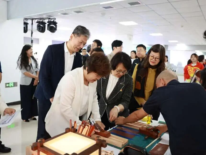 在活动现场的非遗进校园专题展中,15件曾惊艳亮相上合峰会的礼物集体登场,瞬间吸引了众人的目光。其中包括田氏船模、风筝魏、杨柳青木版年画、曾氏华服等,延续了9月上合峰会的国际热度。展览同步呈现新利18平台与非遗传承人共创的榫卯结构文创、巧妹红妆绳艺服饰、曾氏华服改良设计等成果,展现传统技艺与现代设计的碰撞融合。活动最后,与会领导、来宾参观了鲁班工坊体验馆。此次活动为非遗传承注入新活力,我院将以此为契机,推动非遗保护与教育深度融合,让传统文化绽放新光彩。