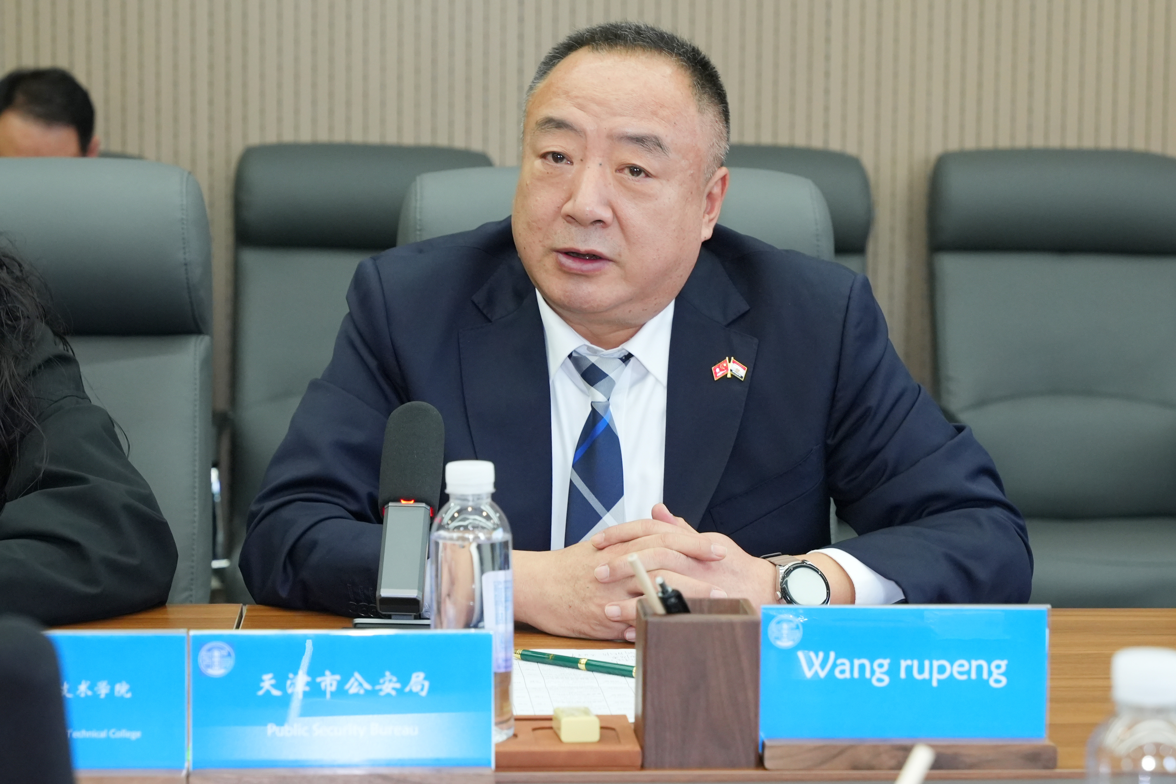 10月22日上午,天津市公安局国际合作总队副队长王汝芃率2025年埃及打击网络犯罪研修班一行15名埃及警官到我院参观交流。我院副院长刘悦凌及国际交流与合作部、校企合作与培训部、安全保卫部相关负责人接待此次来访,埃及留学生小明陪同接待。