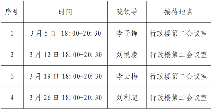 根据学院《院领导接待日管理办法》,现将2024年3月院领导接待日安排通知如下: