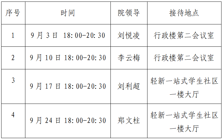 根据学院《院领导接待日管理办法》,现将2024年9月院领导接待日安排通知如下: