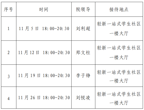 根据学院《院领导接待日管理办法》,现将2024年11月院领导接待日安排通知如下: